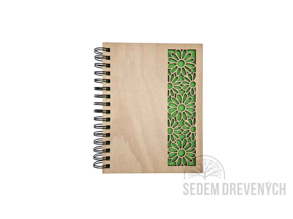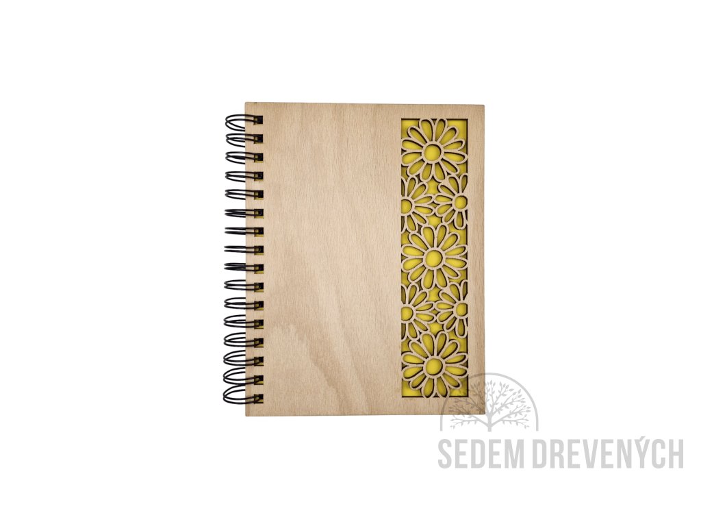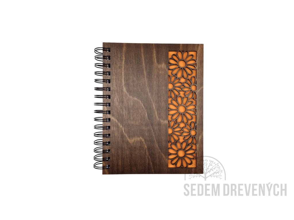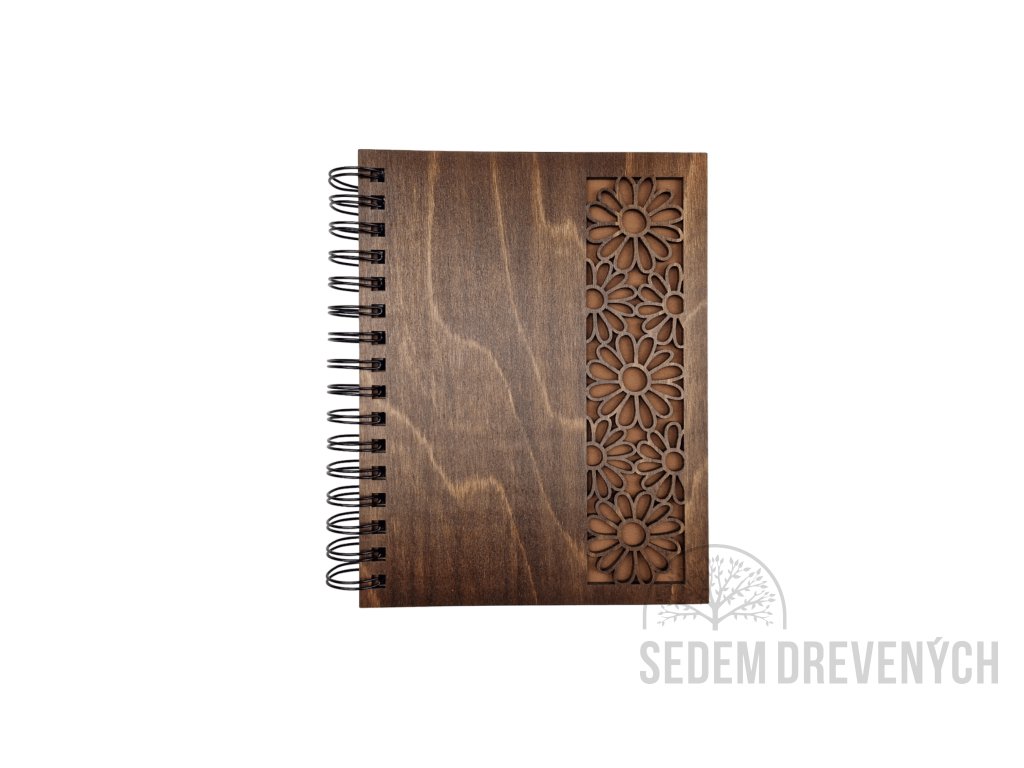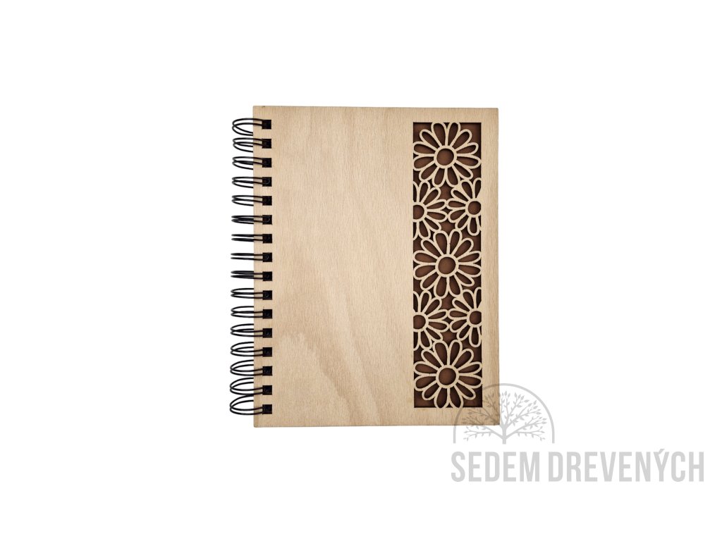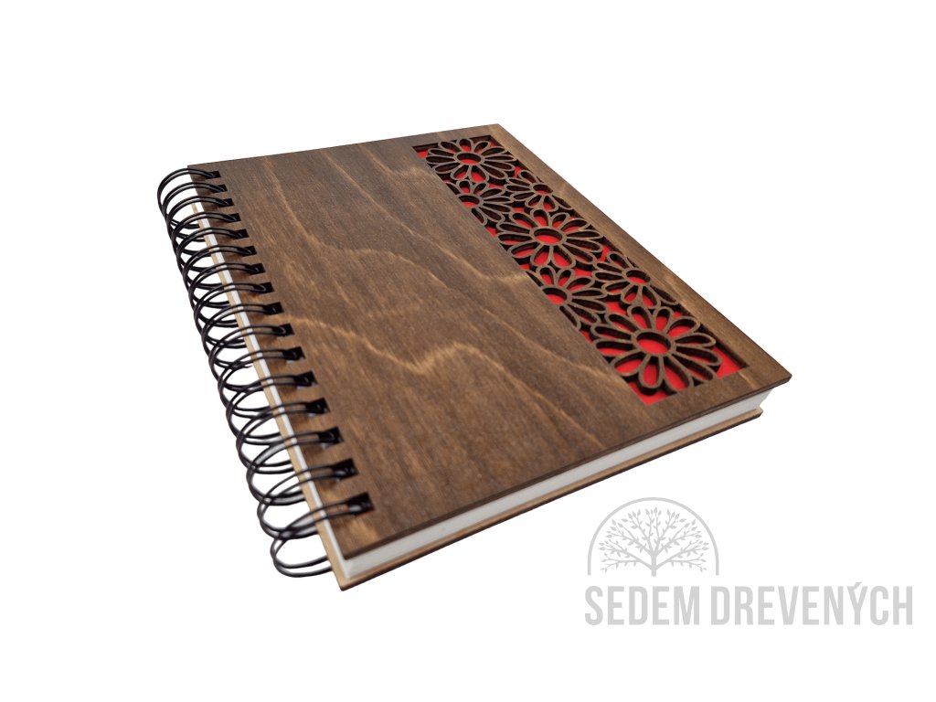 Krásny drevený zápisník z bukovej preglejky, s vyrezaným motívom KVIETKY.