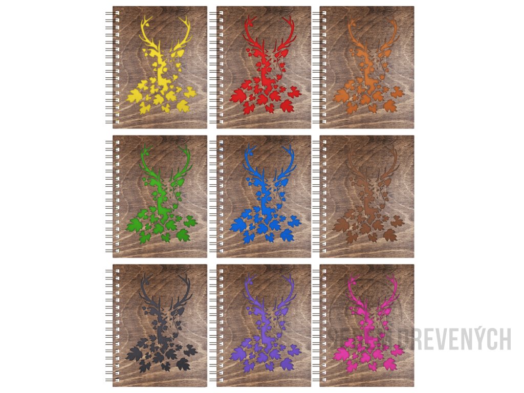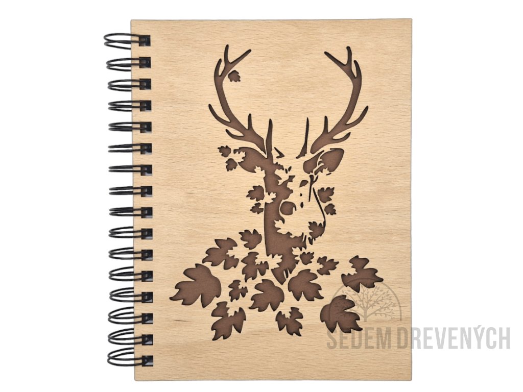 Krásny drevený zápisník z bukovej preglejky, s  vyrezaným motívom JELEŇ.