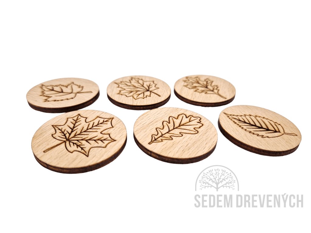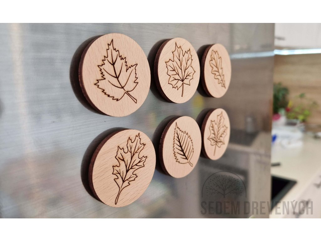 Každá magnetka nesie vygravírovaný motív iného druhu listu, kde jemná kresba dreva a jednoduchý tvar vytvárajú harmonický celok, ktorý nepotrebuje nič viac.