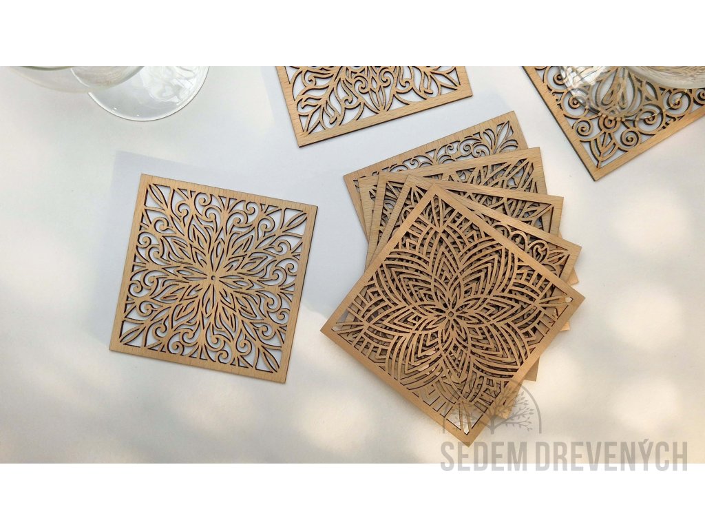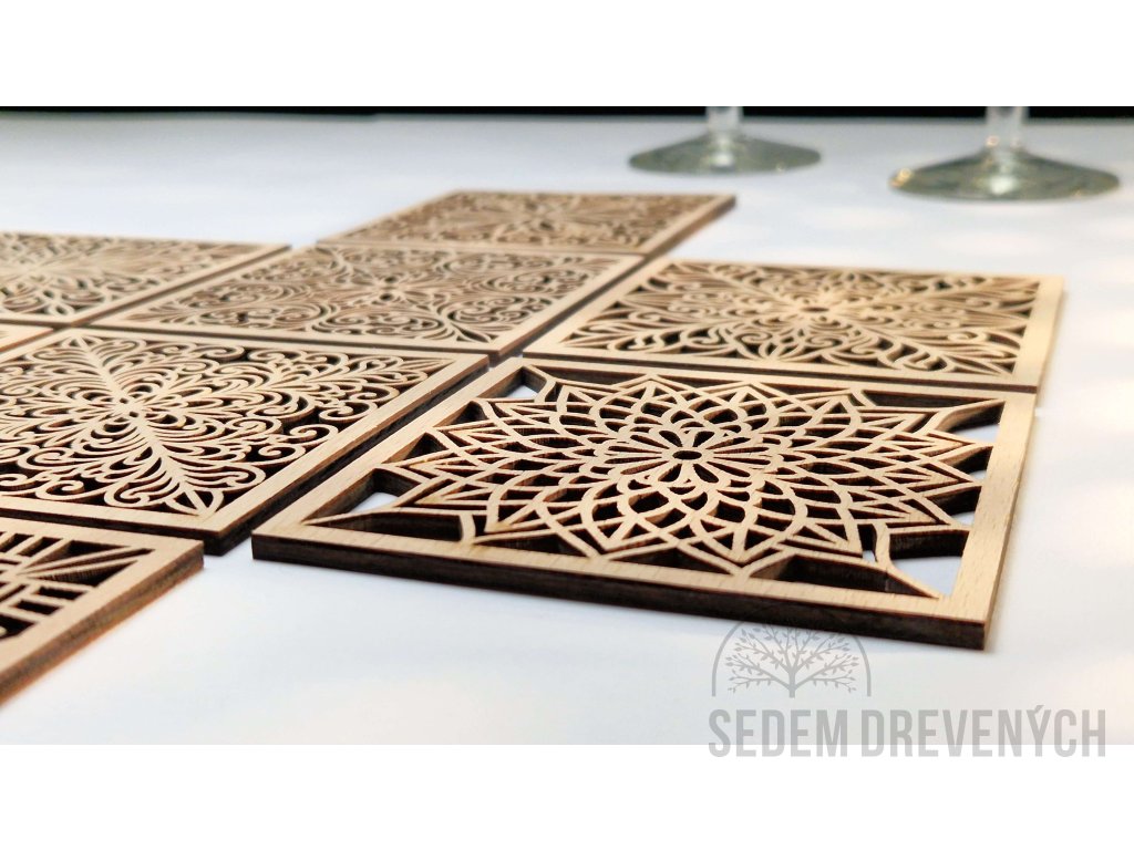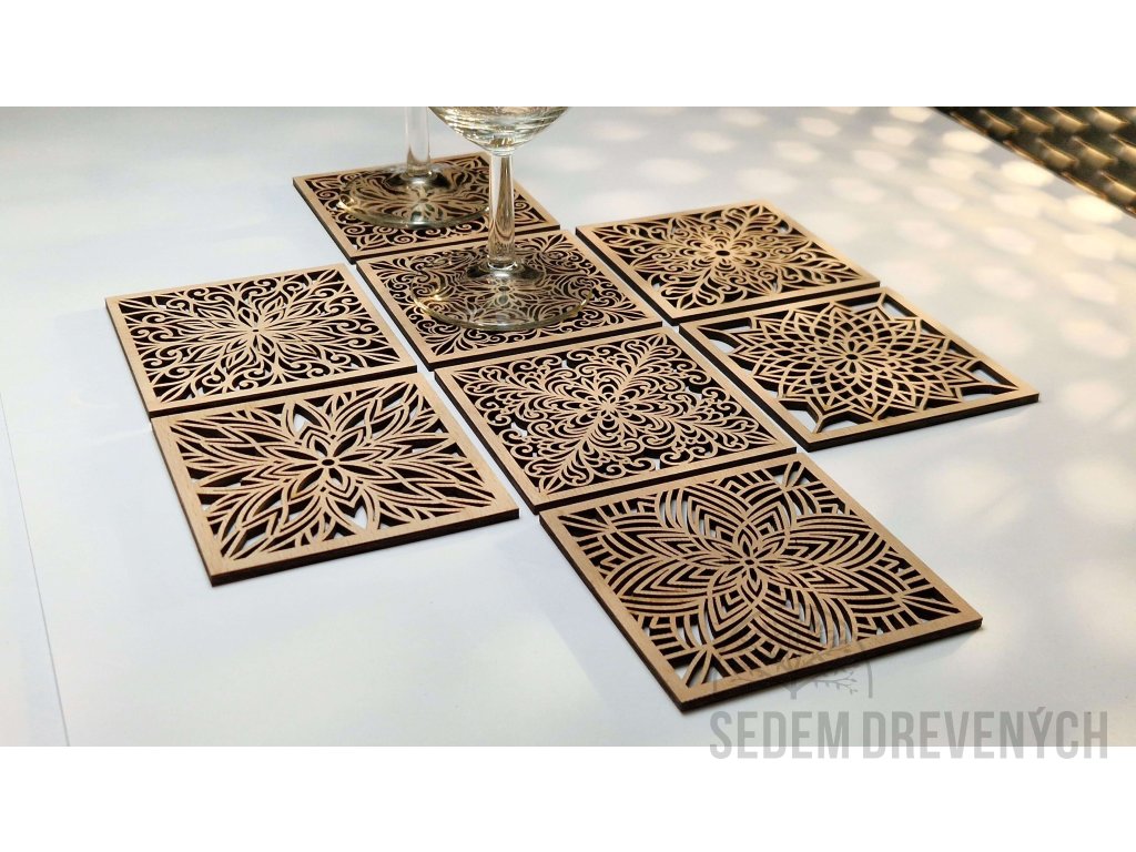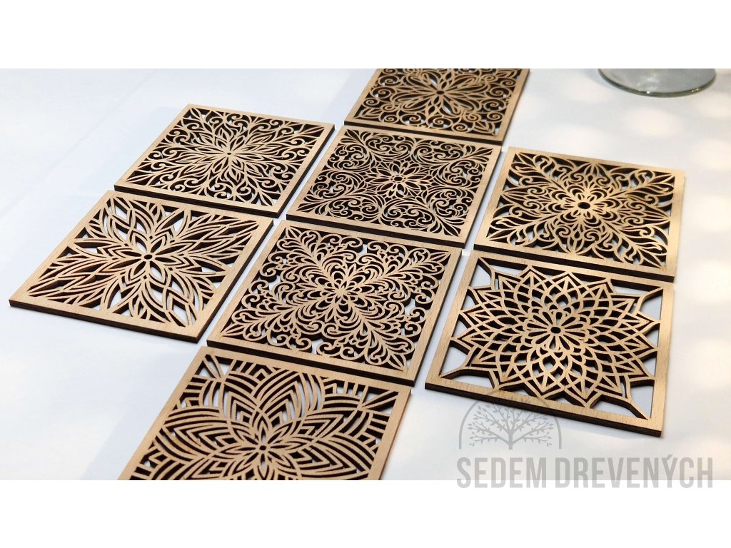 Set 8ks bukových podpivníkov s motívom rozetiek. Krásne dekoratívne podpivníky, ktoré zvládnu aj väčšiu návštevu a skrášlia Vaše spoločné zážitky.